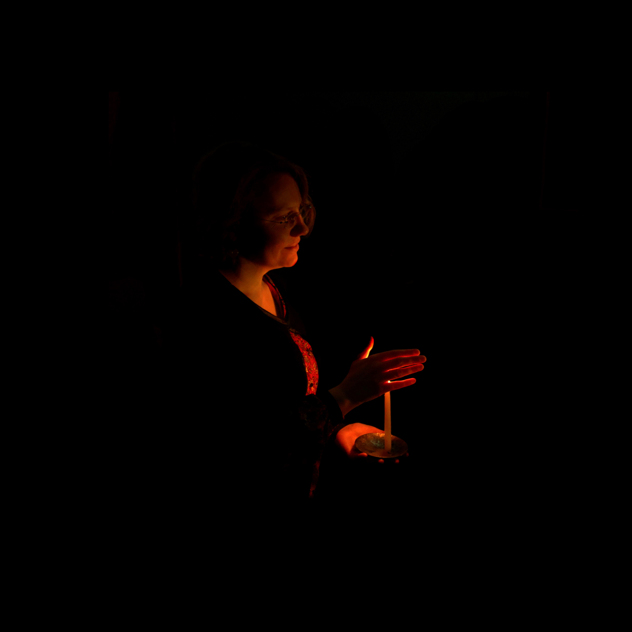 Dans le sombre, avancer pas à pas Enveloppée de rouge, À la lumière de la bougie Indiquer le chemin L’éclaireur repère les lieux Guidée par cette lumière ténue Tel l’enfant quittant la matrice Pour arriver entre leurs mains